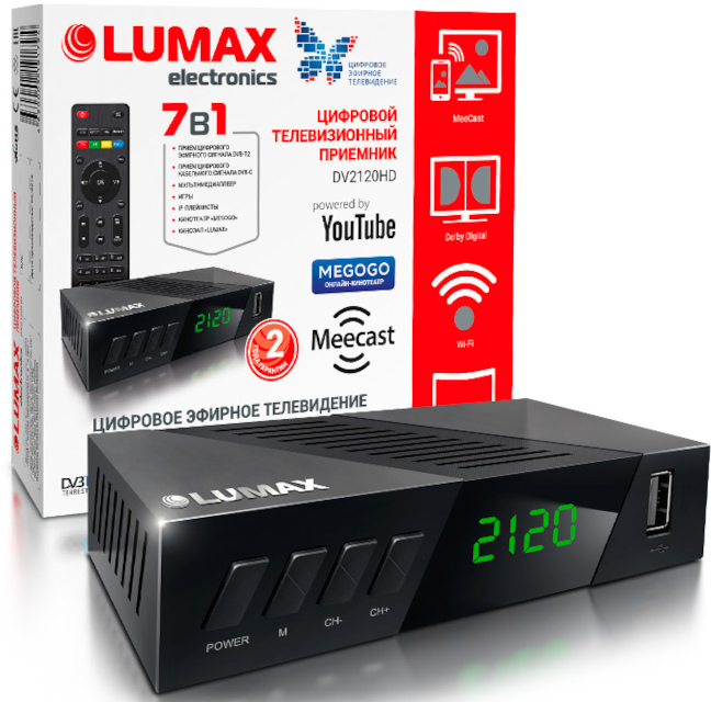 Приставка цифровая 7в1 LUMAX DV2120HDНовейший цифровой телевизионный приемник LUMAX DV2120HD предназначен для качественного приема каналов цифрового эфирного и кабельного телевидения стандартов DVB-T2 и DVB-C. Вы непременно останетесь довольны характеристиками и качеством данного устройства! В конструкции использован мощный процессор. Современная система Dolby Digital Plus обеспечивает многоканальный звук 5.1 и повышенное качество записи звукового контента с эффектом «звук вокруг». Приемник воспроизводит все наиболее актуальные форматы: AVI/MKV/MPG/TS/MP3/JPG/BMP/JPEG/PNG и т. д. Очень удобны функции авто- и ручного поиска телеканалов, записи в реальном времени, родительского контроля, настройки музыки, фото и видео, обновления ПО. С помощью USB Wi-Fi-адаптера LUMAX DV0002HD или через 3G-модемы можно подключить приемник к Интернету и пользоваться популярными приложениями YouTube, Gmail, Погода, а также новыми разделами – IP-плейлистами m3u, MeeCast (передача контента со смартфона на тв) и приложениями «Кинозал LUMAX», онлайн-кинотеатр Megogo, насчитывающими в своих кинотеках более 2500 любимых художественных фильмов, сказок, сериалов и т.п. Защита от короткого замыкания выгодно отличает LUMAX DV2120HD от приемников других производителей. Выбирайте для себя лучшее!