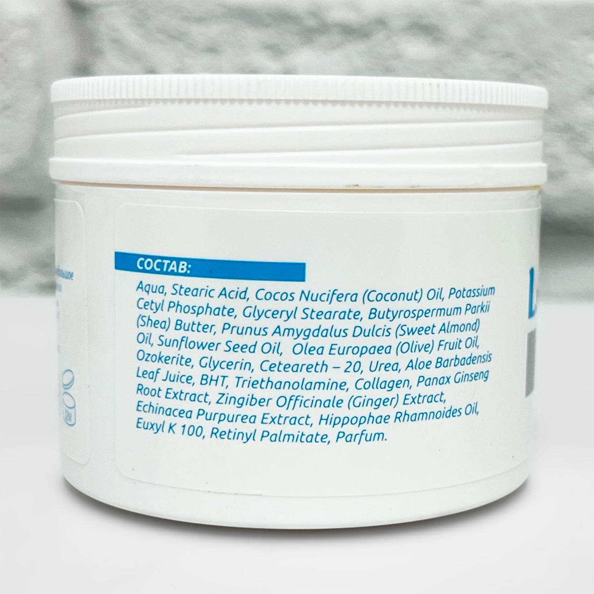 Состав: Aqua, Stearic Acid, Potassium Cetyl Phosphate, Glyceryl Stearate, BHT, Cocos Nucifera (Coconut) Oil (кокосовое масло), Prunus Amygdalus Dulcis (Sweet Almond) Oil (миндальное масло),SunflowerSed Oil (подсолнечное масло), Olea Europaea (Olive) Fruit Oil (оливковое масло), Butyrospermum Parkii (Shea Butter) (масло ши), Hippophae Rhamnoides Oil (облепиховое масло), Ozokerite, Ceteareth – 20, Triethanolamine, Glycerin, Urea, Collagen, Retinyl Palmitate (витамин А), Panax Ginseng Root Extract (экстракт женьшеня), Aloe Barbadensis leaf Juice (сок алоэ), Zingiber Offcinale (Ginger) Extract (экстракт имбиря), Exinacea Purpurea Extract (экстракт эхинацеи), Phenoxyethanol (89,9%), Ethylhexylglycerin (10,1%), Benzyl Alcohol, Methylehloroisothiazolinone, Methylisothiazolinone, Parfum.