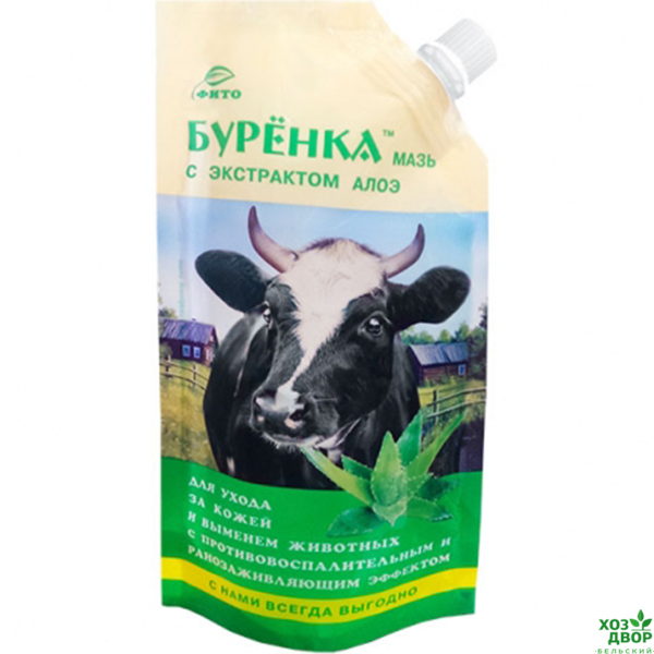 Мазь Буренка серии ФИТО с натуральным экстрактом лекарственного растения алоэ является защитно-профилактическим средством для ухода за кожей и выменем дойных коров.Мазь упаковывается в современную экономичную упаковку «дой-пак» из многослойной ламинированной пленки, с дозатором.