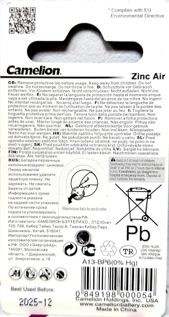 Батарейка Camelion ZA13 BL-6 1шт для слуховых аппаратовБатарейка Camelion ZA13 дисковый элемент питания, который служит для установки в специализированный аналоговый или цифровой аппарат повышения четкости слуха человека. Изделие имеет достаточную емкость для длительной работы.