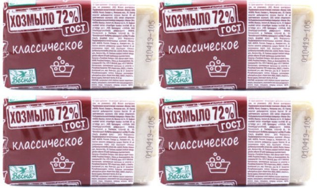 Весна мыло хозяйственное Классическое 72% п/э 140гСостав: вода, глицерин, гидроксид натрия, натрия хлорид, натриевые соли жирных кислот пальмового масла, натриевые соли жирных кислот кокосового масла, тетранатрия эдта, натриевые соли масел натуральных животных жиров.