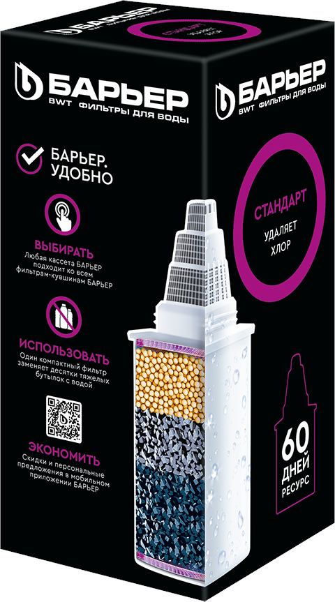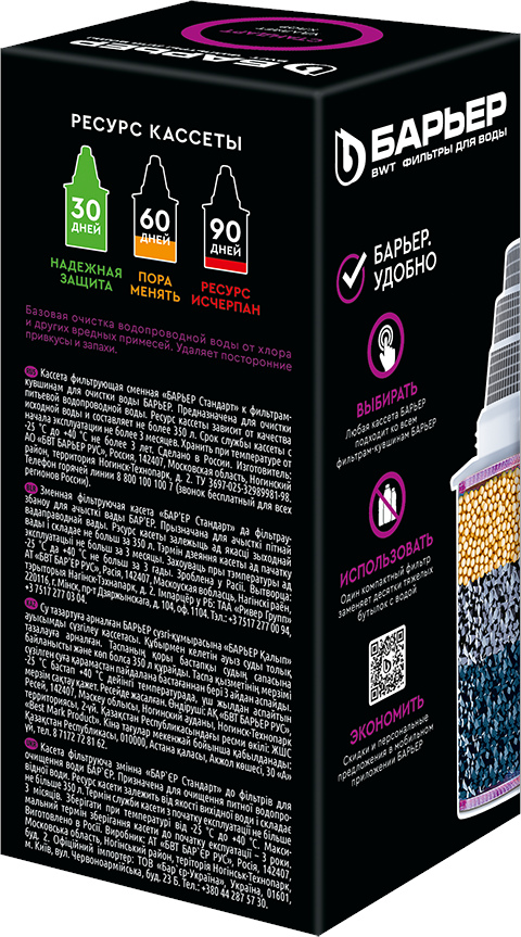 Все кассеты БАРЬЕР подходят ко всем кувшинам БАРЬЕР. Одна кассета БАРЬЕР способна заменить несколько сотен пластиковых бутылок. По окончанию ресурса кассеты можно сдать на переработку.
