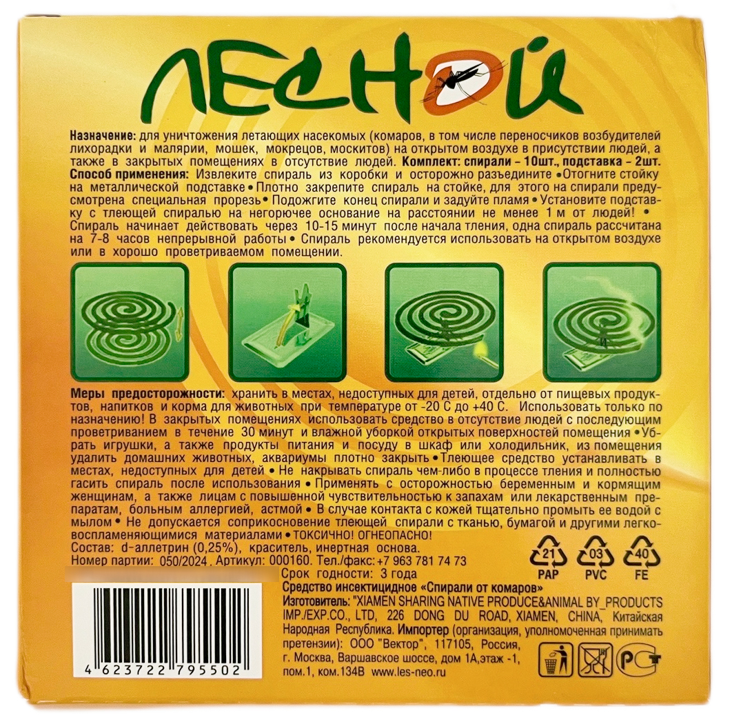 Спирали от комаров ЛеснойПрименяется для уничтожения летающих насекомых (комаров, в том числе переносчиков возбудителей лихорадки и малярии, мошек, мокрецов, москитов) на открытом воздухе в присутствии людей, а также в закрытых помещениях в отсутствии людей.