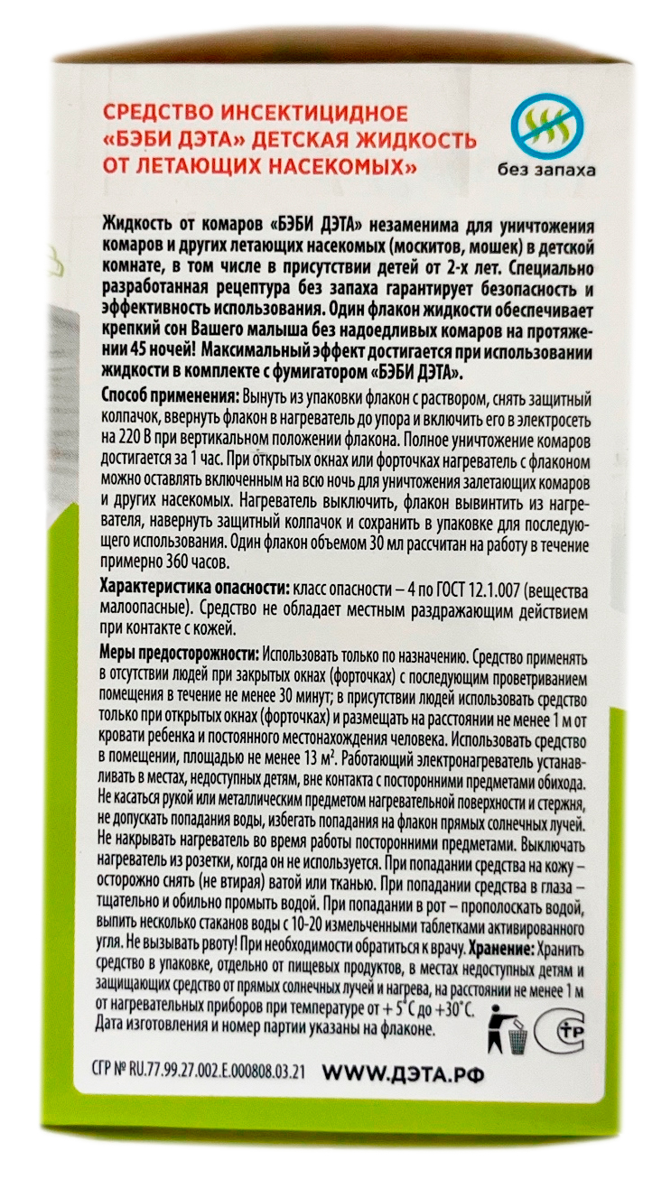 Жидкость Дэта-Бэби 45 ночейЖидкость "Бэби Дэта" незаменима для уничтожения комаров и других летающих насекомых (москитов, мошек) в детской комнате.
