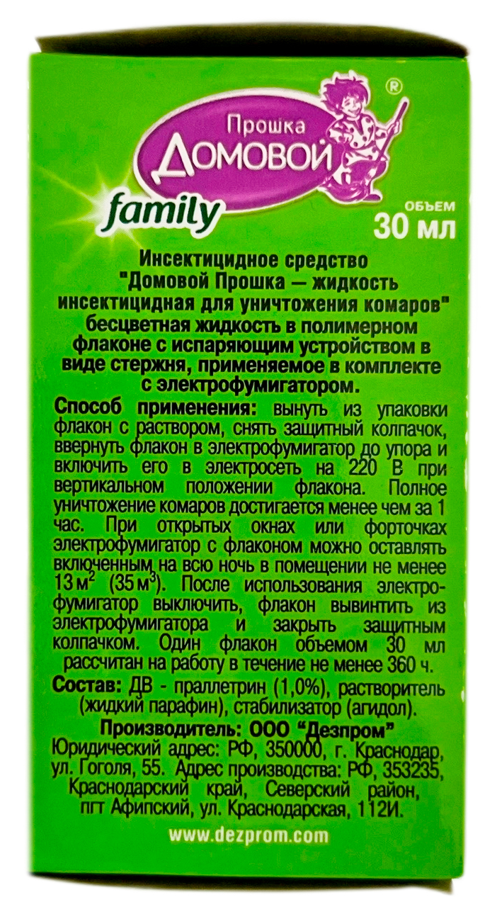 Прошка Домовой family жидкость от комаров 30млДля уничтожения комаров в помещениях в присутствии детей любого возраста.
