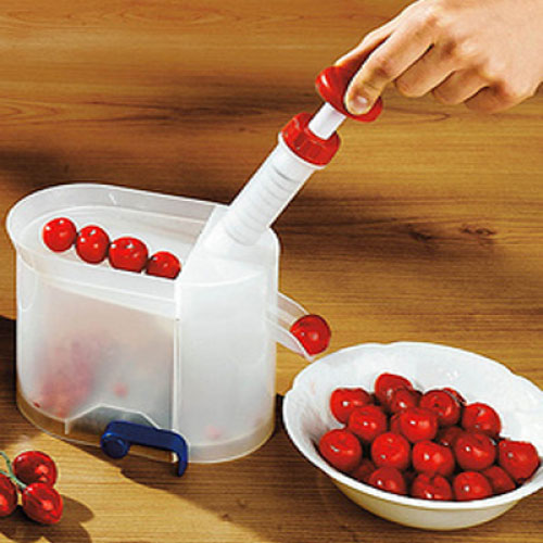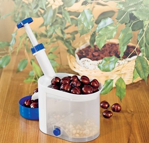 Достаточно всего лишь положить вишню или черешню в специальную емкость, нажать на рукоятку, и косточки упадут в предназначенную для этих целей тару.