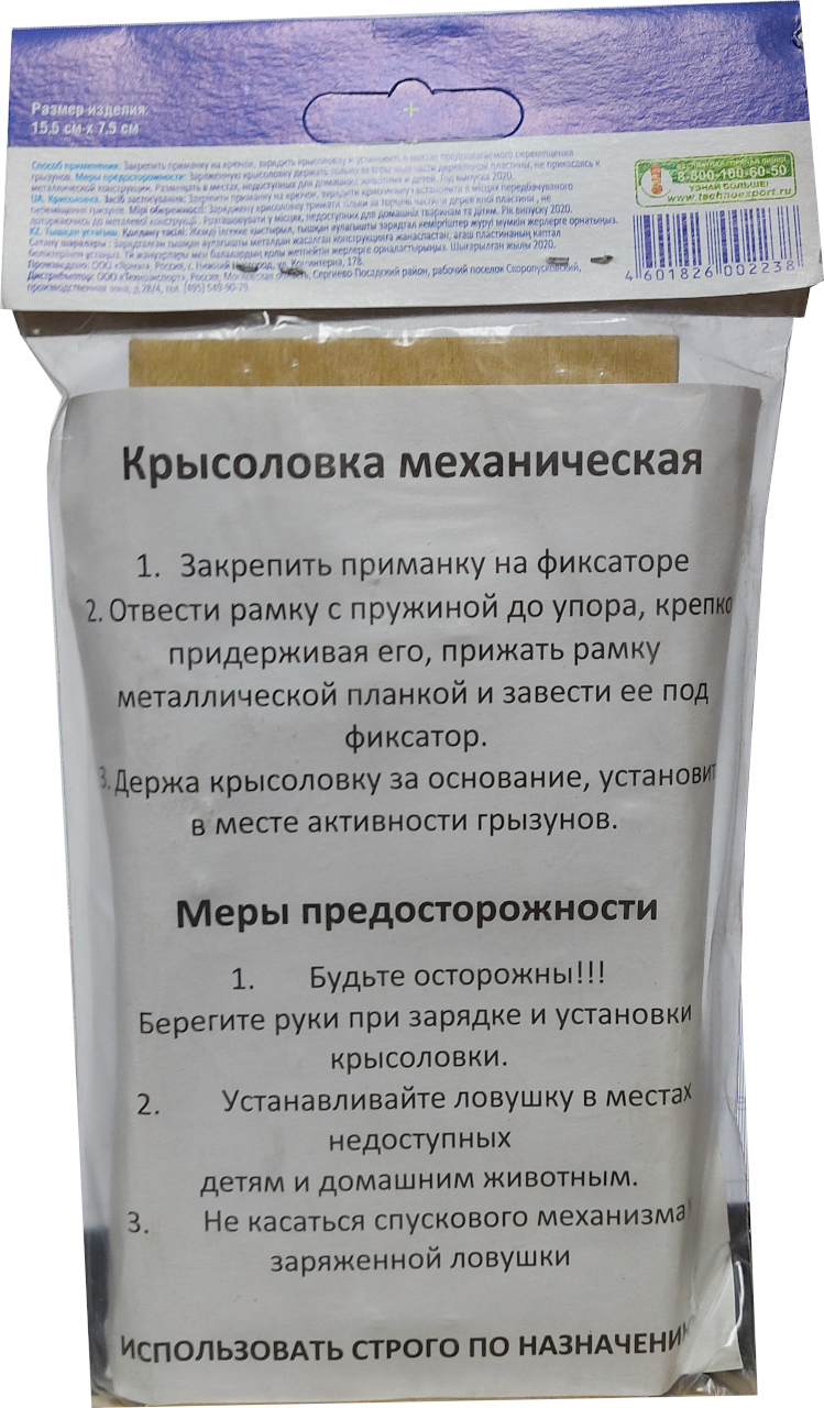 Мышеловка крысоловка деревянная 15,5*7,5см Чистый домУстройство изготовлено на деревянной основе и имеет металлический пружинный рычаг. Прикоснувшись к приманке, грызун приводит его в действие. Капкан захлопывается мгновенно.