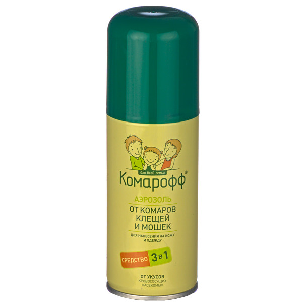 Аэрозоль "Комарофф" предназначен для эффективной защиты от укусов кровососущих насекомых (комаров, мошек, слепней, мокрецов, москитов и блох). Нейтрален для кожи. Обеспечивает эффективную защиту до четырех часов.Состав: 10% N,N-диэтил-m-толумид, 10% диметилфталат, 37,85% спирт изопропиловый, пропиленгликоль, глицерин, пропеллент углеводородный, масло эфирное мятное.