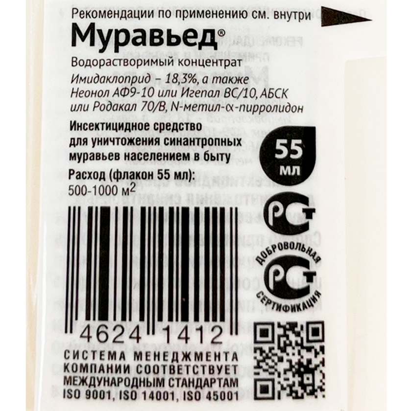 «Муравьед» — препарат контактно-кишечного действия. Применяется на приусадебных участках, отмостках домов, в щелях между садовыми плитами. Он попадает в организм насекомых, оказывая губительное влияние на их нервную систему: вызывает торможение мышечной деятельности, судороги, а затем полный паралич. Положительные особенности препарата — отсутствие привыкания к нему муравьев и экономичный расход. Муравьи исчезают в течение не более трех суток после обработки. Защитный эффект сохраняется на протяжении не менее 3 недель.