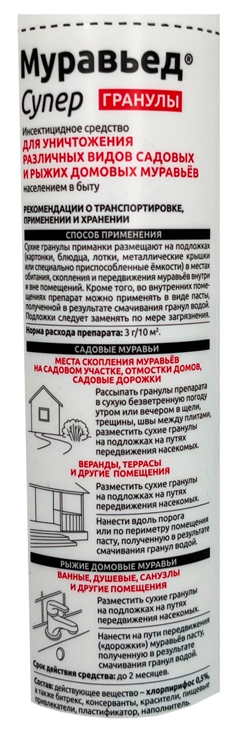 Муравьед Супер - средство для борьбы со всеми видами домовых и садовых муравьёв.Имеет контактно-кишечное воздействие, поэтому уничтожает муравьёв и при поедании насекомыми приманки, и при попадании на вредителя.