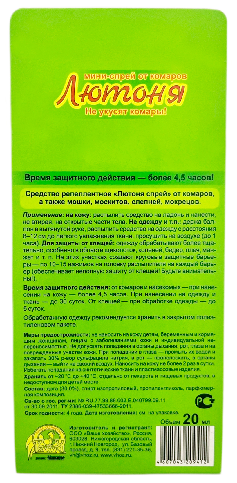 ЛЮТОНЯ мини-спрей от комаров 20млРепеллентное средство от комаров, а также мошек, москитов, слепней, мокрецов. Время защитного действия — более 4,5 часов! Класс эффективности — высший!