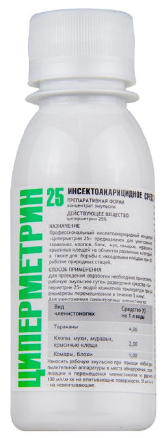 Циперметрин 25 - инсектицид широкого спектра действия, эффективность которого подтверждается отзывами клиентов и опытом специалистов нашей службы дезинфекции. Средство предназначено для профессионального использования, но часто используется и населением в быту (с осторожностью).Действующее вещество: циперметрин (25%)Остаточная активность: 1-1,5 месяцаНорма расхода рабочего раствора50 мл на кв.м при обработке невпитывающих поверхностей и 100 мл на кв.м. для впитывающихОбласть использованияПриродные стации (для уничтожения иксодовых клещей)Жилые и нежилые помещения различного назначенияПредприятия общепита, гостиницы, хостелы, дома отдыха.Характеристики
