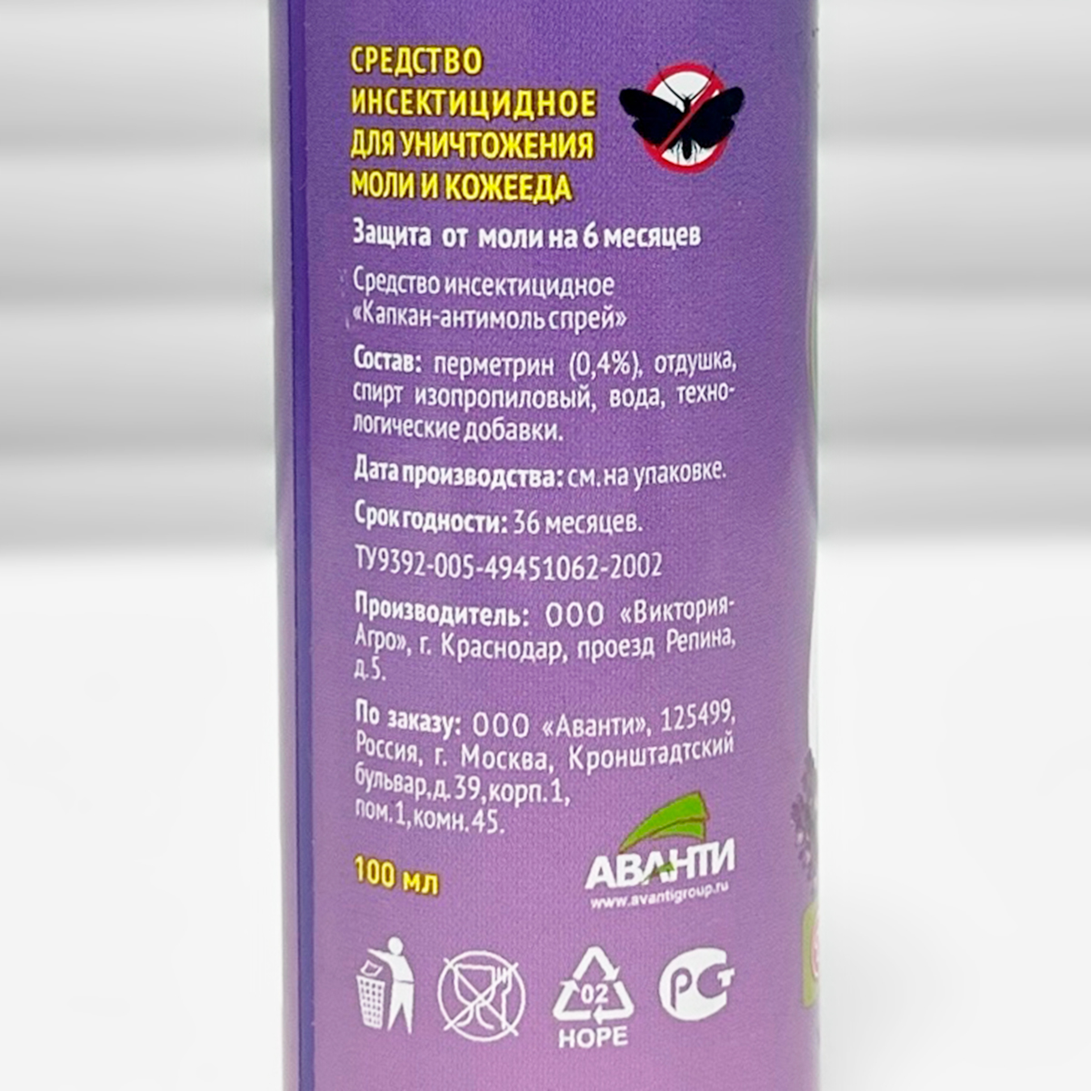 ЗАЩИТА ОТ МОЛИ ARGUS лаванда спрей 100млСредство инсектицидное для уничтожения моли и кожееда "капкан-антимоль спрей".
