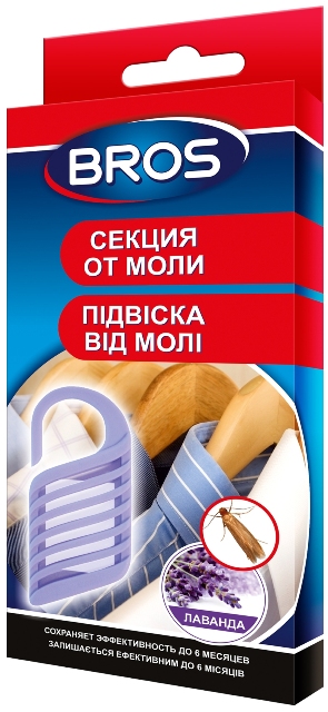 Антимоль подвеска лаванда BROS 1штСекция с запахом лаванды для применения в гардеробах, шкафах и ящиках. Эффективно защищает от моли (до 6 месяцев). Придаёт одежде приятный и свежий запах.