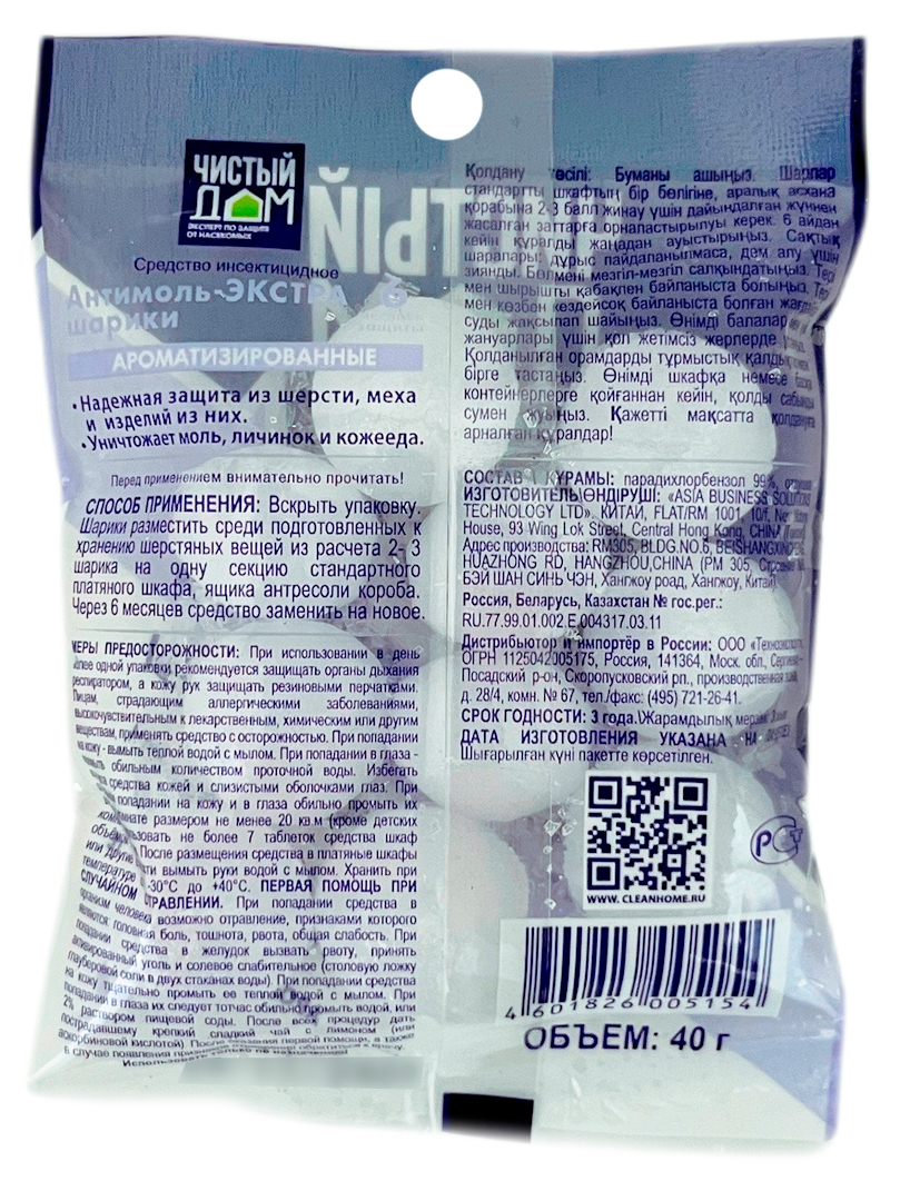 Антимоль - экстра шарики Чистый дом 40гАнтимоль в виде шариков от торговой марки «Чистый дом» — это надёжная защита изделий из шерсти, меха от повреждения молью.