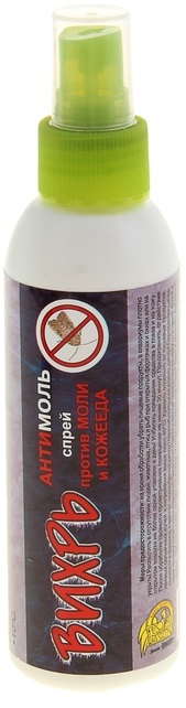 Спрей «Вихрь-Антимоль» — для защиты шерсти, меха и изделий из них от моли и кожеедов.Применение: упаковку встряхнуть в течение 2 секунд. Нажимая на распыляющее устройство, обработать изделие или ткань с расстояния 20–25 см из расчета 10 г/м² обрабатываемого изделия около 60 нажатий на распылительную головку. Для усиления действия обработать внутреннюю поверхность шкафа (комода), распыляя средство на всю её площадь. Одна упаковка объемом 300 мл предназначена для обработки 30 м² поверхности ткани в комнате площадью не менее 30 м². В комнате площадью 10–15 м² обрабатывать не более 5–10 м² ткани. При необходимости обработку повторить через 6 месяцев. Распылять при температуре не ниже +10° С.