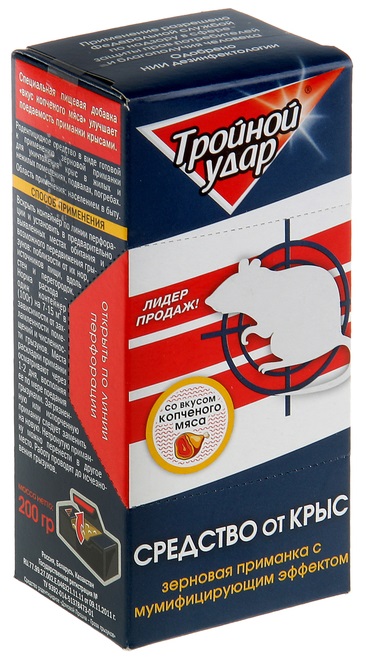 Универсальное готовое к применению средство от мышей, крыс и полевок «Домовой Прошка ТРОЙНОЙ УДАР» обладает отличной поедаемостью грызунами, так как его основа - натуральные зерна пшеницы.Действие активного компонента (дифенацин) обеспечивает эффективное уничтожение грызунов в течение 4 - 8 дней. Специальная пищевая добавка - вкус копченого мяса - улучшает поедаемость отравленной приманки крысами и мышами.