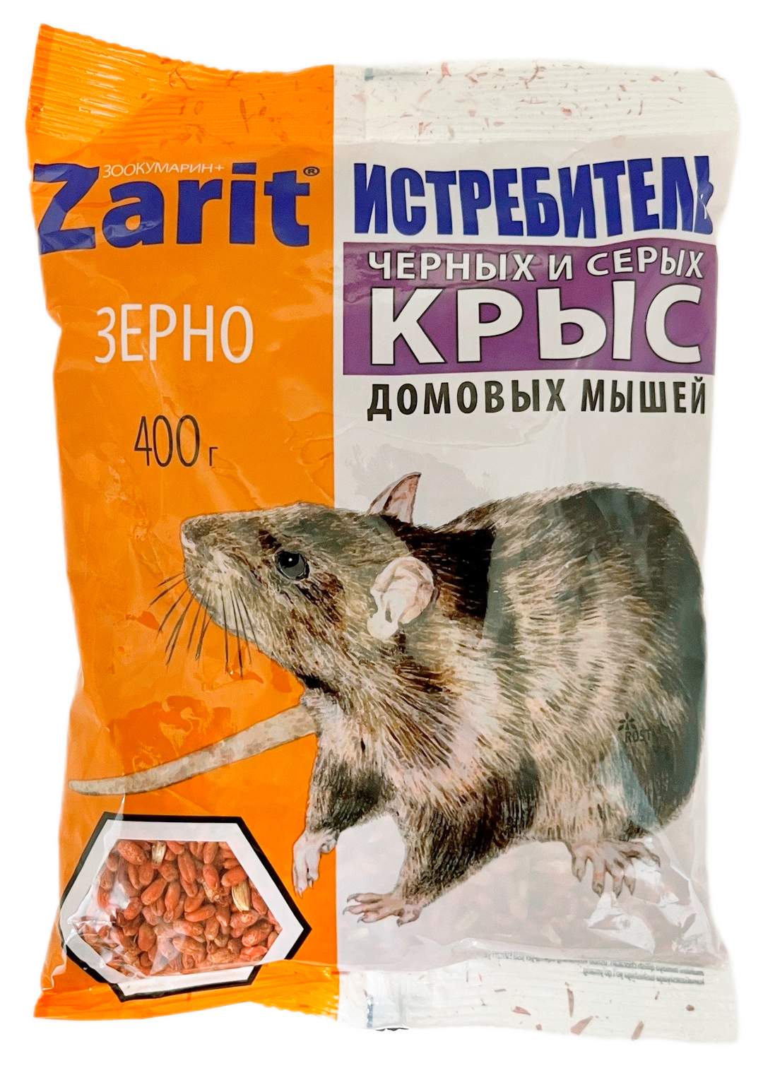 Средство от крыс и мышей Zarit зерно ИСТРЕБИТЕЛЬ ЗООКУМАРИН+ 400гОбладает высокой привлекающей способностью для крыс и мышей. Активно даже в отношении грызунов, не чувствительных к другим ядам. Вызывает удушье мышей и крыс - гибель наступает, как правило, на открытых местах, а не в норах.