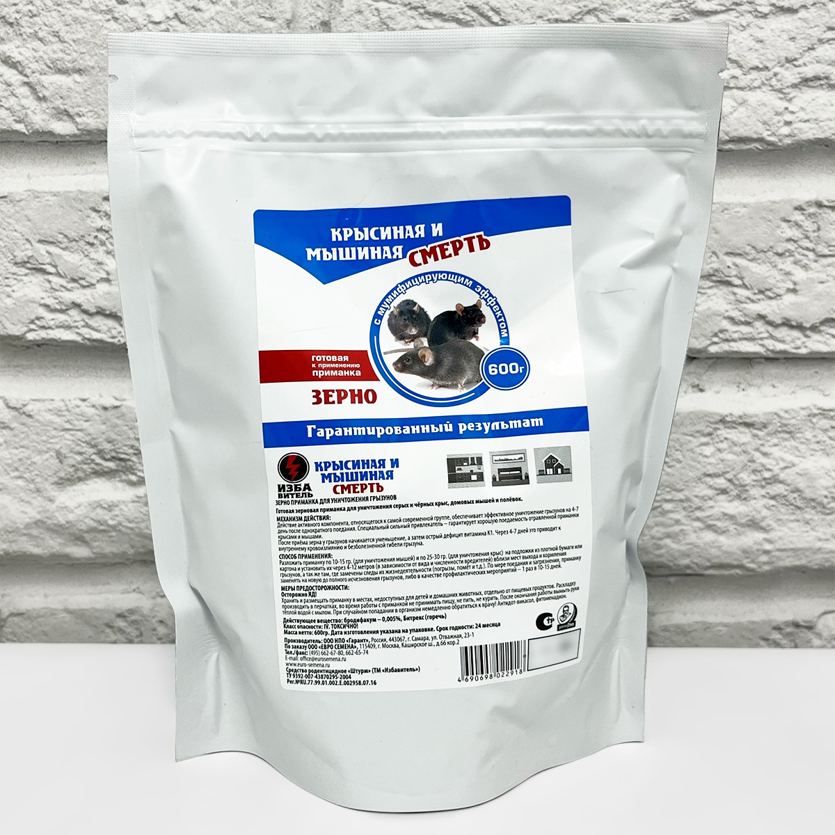 ИЗБАВИТЕЛЬ Крысиная и мышиная смерть 600г зерноГарантированный результат. Готовая приманка с мумифицирующим эффектом.