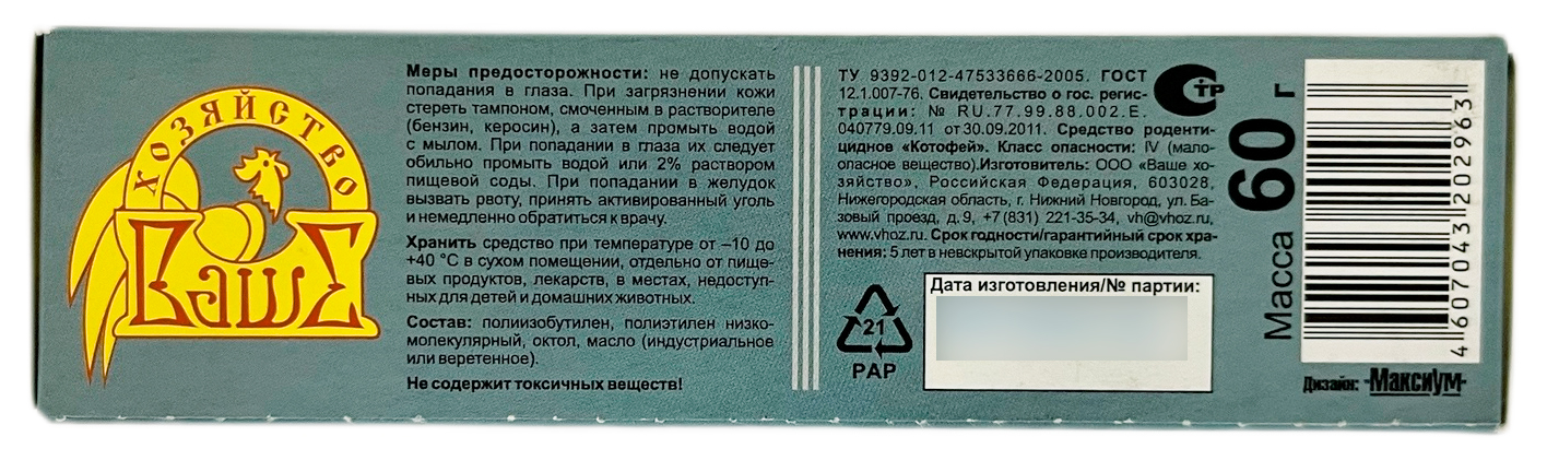 Легко наносится на подложки, имеет оптимальную консистенцию, не растекается. В «намазанном» виде очень, очень долгое время не высыхает, не покрывается коркой и не теряет своих свойств. Прекрасно ловит мышей как в сухих, так и во влажных помещениях, а также вне помещений.