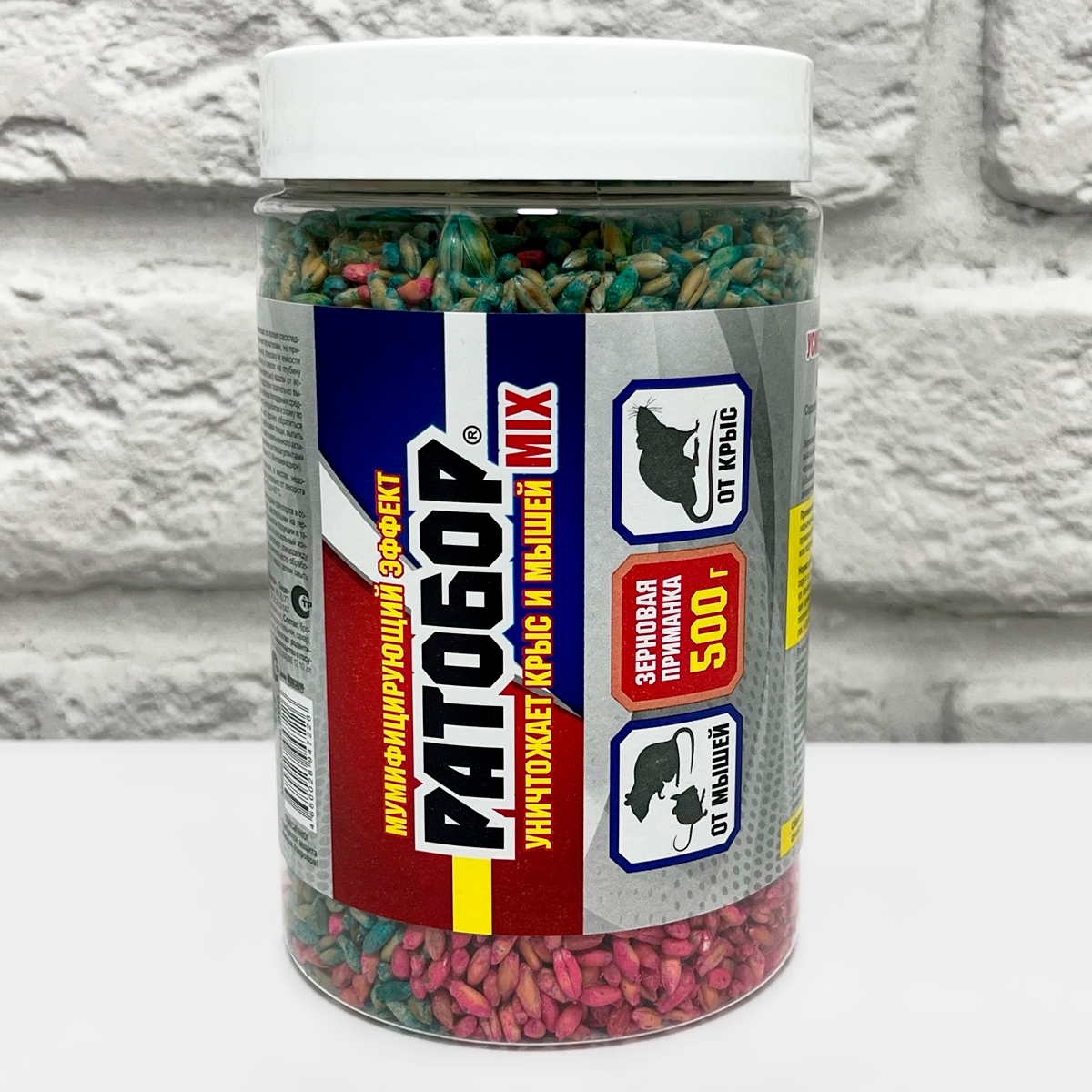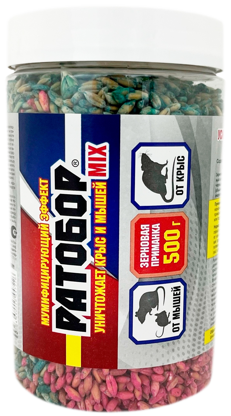 РАТОБОР MIX 500гУничтожает мышей и крыс, мумифицирующий эффект. Зерновая приманка. Содержит 2 препарата с двумя разными действующими веществами.