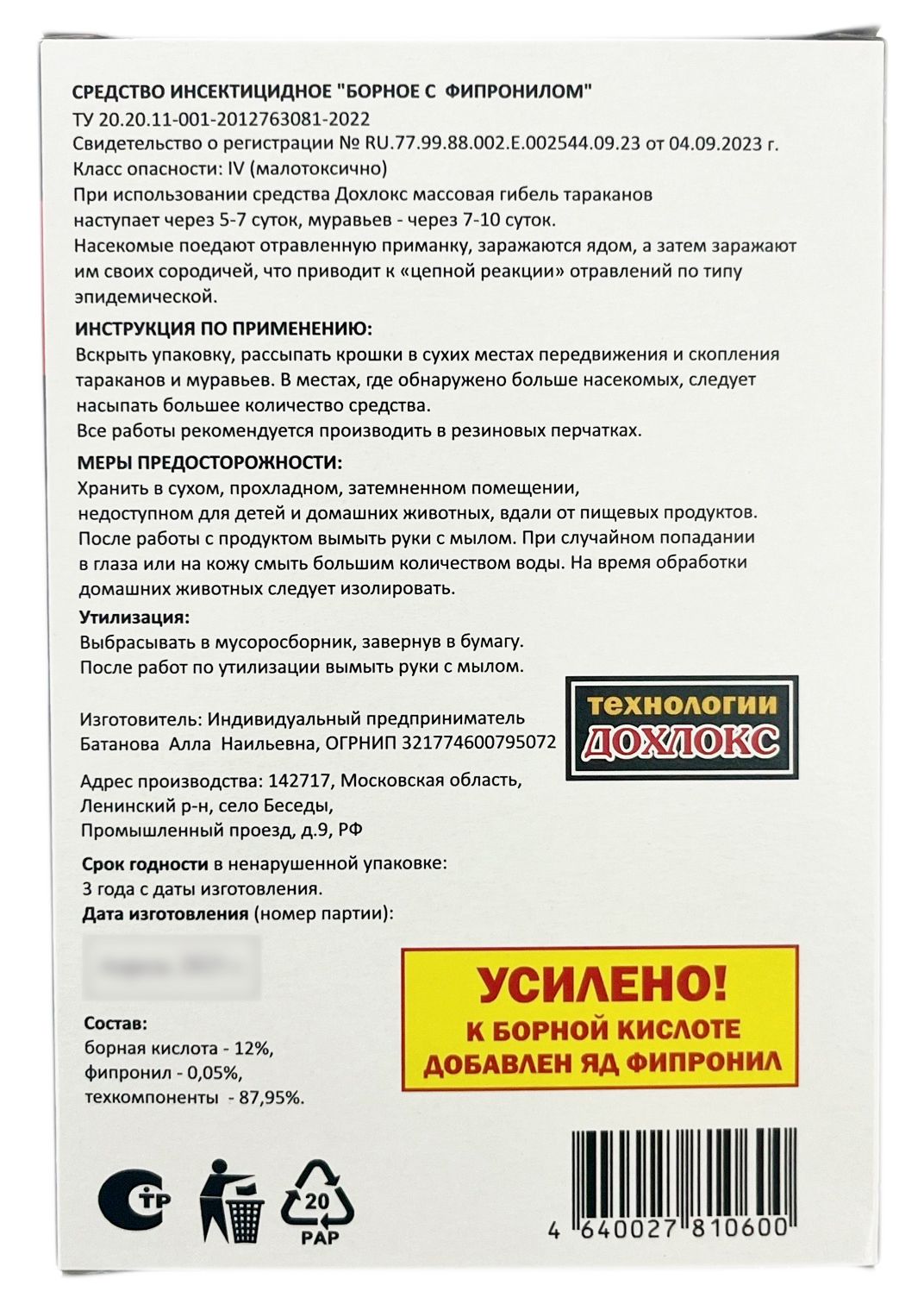 Состав: борная кислота 12%, фипронил 0,05%, техкомпоненты 87,95%.