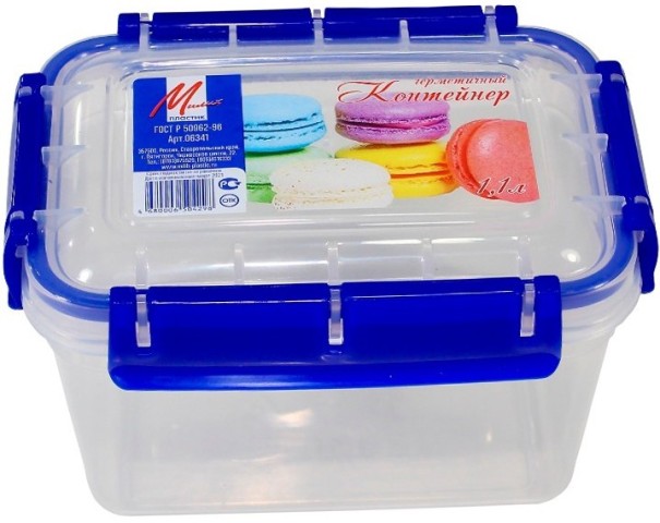 Контейнер герметичный 1,1л 06341 МилихПластикКонтейнер абсолютно герметичен. Пластиковая крышка оснащена четырьмя специальными защелками и силиконовым уплотнителем. Герметичный контейнер - незаменимая вещь для хранения пищи вне дома. Вы можете смело брать его с собой на работу или на отдых. Силикон - экологически безопасный материал, не выделяющий вредных веществ при взаимодействии с пищей. Если у вас вошло в привычку брать на работу домашнюю еду, с этим контейнером вы можете разнообразить свой рацион. Контейнер подходит для хранения продуктов в холодильнике или морозильнике, а также для разогревания в микроволновой печи с открытой крышкой.