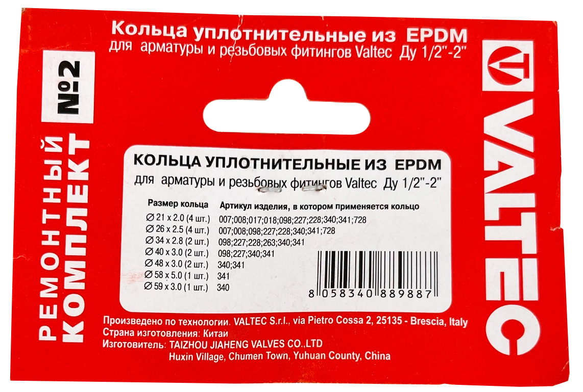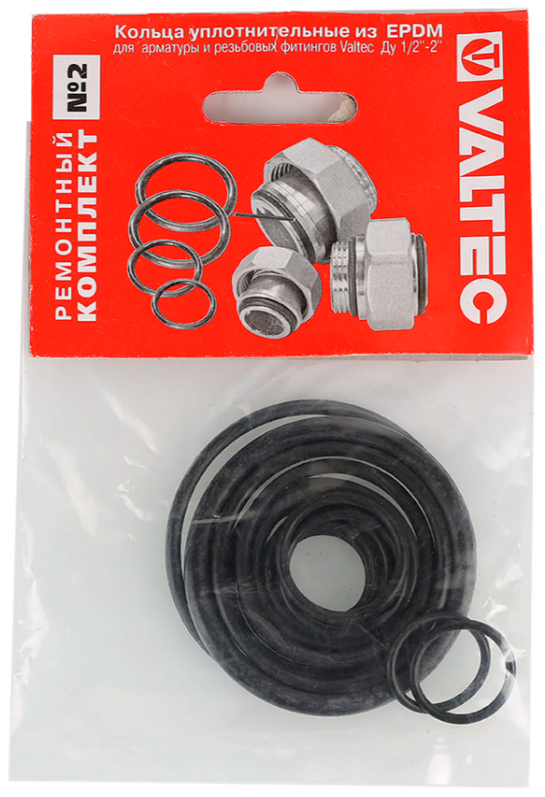 Набор прокладок Ремкомплект Valtec №2Набор уплотнительных колец торговой марки VALTEC используется совместно с арматурой, резьбовыми фитингами Ду 1/2-2 дюймов. Назначение колец – уплотнение разборных резьбовых соединений при ремонте, монтаже кранов, клапанов, фитингов указанных диаметров. В качестве материала производителем выбрана резина специального состава (EPDM). Уплотнительные кольца характеризуются высокими упругими свойствами, продолжительным сроком эксплуатации.