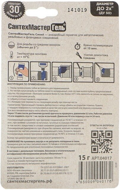 Гель СантехМастер синий 15гСантехМастер Гель Синий — это резьбовой герметик для сантехники со средней степенью фиксации соединения. Данный состав рекомендован к использованию для герметизации металлических резьб, фитингов и фланцев до 2 дюймов. Основными достоинствами этого анаэробного герметика являются быстрота полимеризации, легкость в использовании и простота последующего демонтажа соединения. Данный сантехнический герметик позволяет добиться стопроцентной герметизации и не разрушается под действием любых сред: вода, бензин, природный и сжиженный газ, антифриз, моторное масло, ацетон, фреон, спирт, моторное масло, тормозная и трансмиссионная жидкости. Клей-герметик быстро сохнет и превращается в полимер в зазорах соединения при комнатной температуре. Для полимеризации состава кислород не требуется.