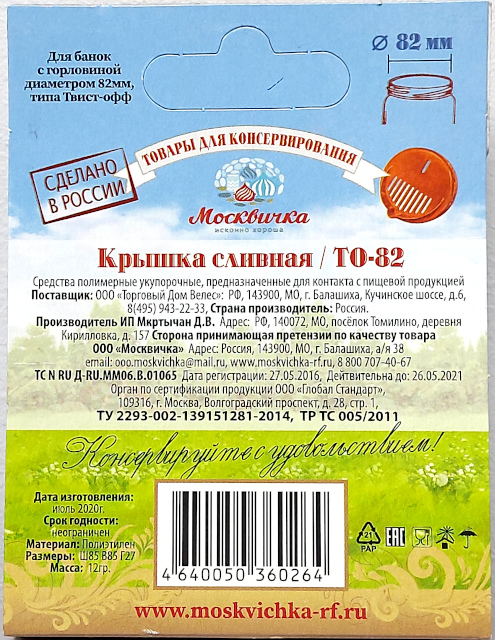 Крышка пластиковая для слива твист-офф 82мм Москвичка