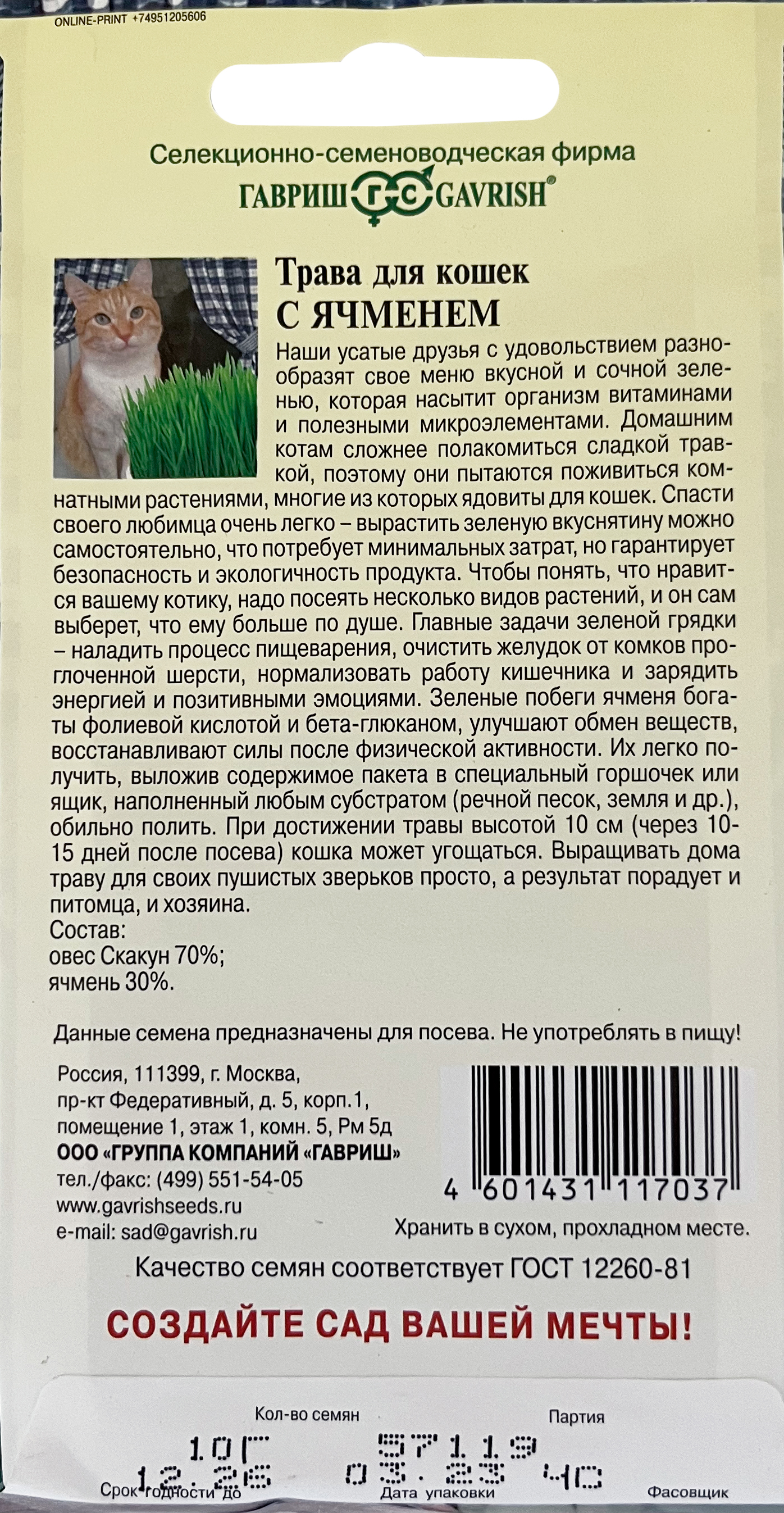 Трава для кошек с ячменемНаши усатые друзья с удовольствием разнообразят свое меню вкусной и сочной зеленью, которая насытит организм витаминами и полезными микроэлементами. Домашним котам сложнее полакомиться сладкой травкой, поэтому они пытаются поживиться комнатными растениями, многие из которых ядовиты для кошек. Спасти своего любимца очень легко — вырастить зеленую вкуснятину можно самостоятельно, что потребует минимальных затрат, но гарантирует безопасность и экологичность продукта. Чтобы понять, что нравится вашему котику, надо посеять несколько видов растений, и он сам выберет, что ему больше по душе. Главные задачи зеленой грядки – наладить процесс пищеварения, очистить желудок от комков проглоченной шерсти, нормализовать работу кишечника и зарядить энергией и позитивными эмоциями. Зеленые побеги ячменя богаты фолиевой кислотой и бета-глюканом, улучшают обмен веществ, восстанавливают силы после физической активности. Их легко получить, выложив содержимое пакета в специальный горшочек или ящик, наполненный любым субстратом (речной песок, земля и др.), обильно полить. При достижении травы высотой 10 см (через 10-15 дней после посева) кошка может угощаться. Выращивать дома траву для своих пушистых зверьков просто, а результат порадует и питомца, и хозяина. Состав: овес Скакун 70%, ячмень 30%.