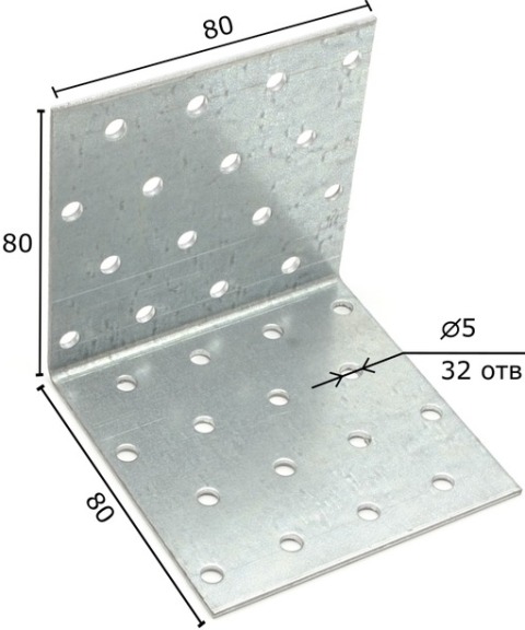 Уголок крепежный 80*80*80*2ммУголок крепежный равносторонний применяется для соединения различных деревянных конструкций под углом 90°. Используются крепежный уголок для крепления брусков, реек в перекрестных соединениях. Представляет собой стальную полосу толщиной 2 мм, согнутую по середине, под углом 90° с отверстиями для крепежных элементов. Монтаж к деревянному основанию производится с помощью гвоздей или саморезов. Данный перфорированный крепеж широко используется в деревянном домостроении, при сборке мебели, лестниц и прочих деревянных конструкций. Уголок крепится гвоздями или саморезами. Имеются отверстия Ø 0,5 мм. При монтаже, для соблюдения оптимальной нагрузки гвозди или саморезы крепят в отверстие, расположенные ближе к изгибу уголка. На один монтажный узел используйте два крепежных элемента.