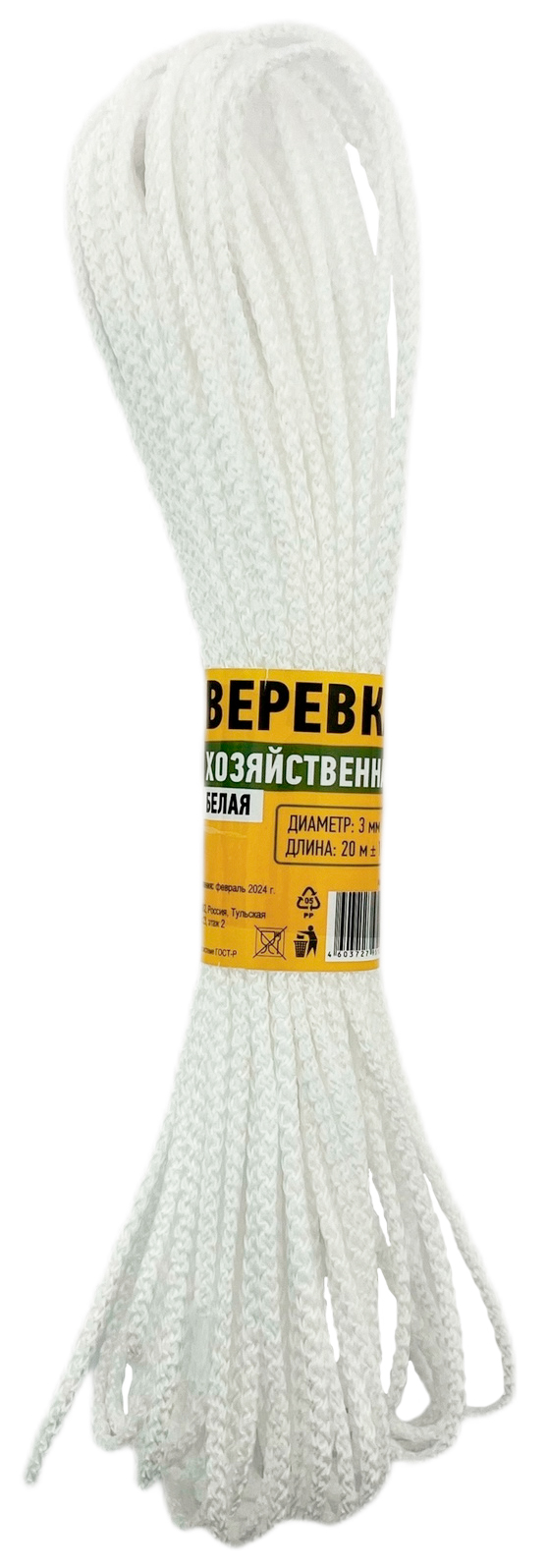 Веревка хозяйственная белая 3мм 20мВеревка хозяйственная – изделие для хозяйственных нужд, которое пригодится как дома, так и на даче. С его помощью можно надежно зафиксировать грузы, хорошо упаковать сельскохозяйственный инвентарь, использовать при облагораживании приусадебного участка.